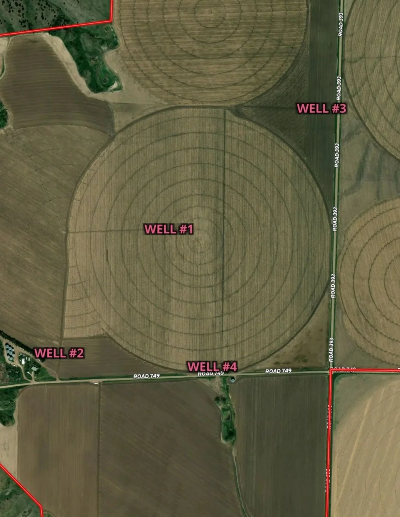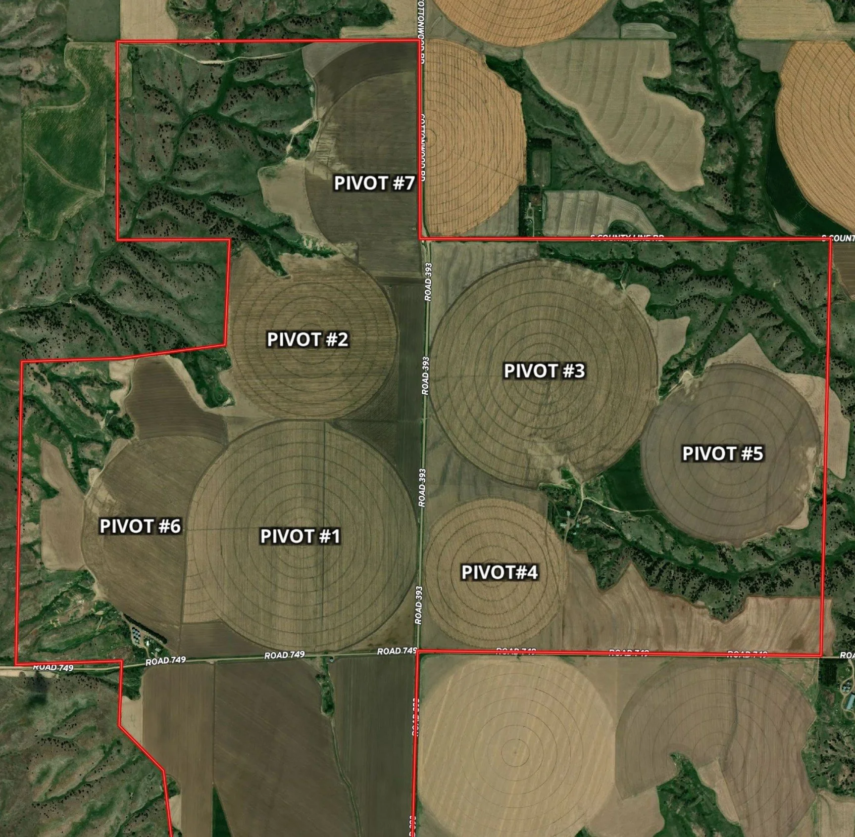 Gravity irrigated cropland is notably concentrated in Section 9, with approximately 300 acres primarily watered by Well #4, though Well #2 can supplement as needed. The remainder of the gravity irrigated acres is intermixed with the pivot-irrigated fields, enabling strategic crop rotation and water management. Non-irrigated cropland is also intermixed throughout, with notable 52-acre and 50-acre fields positioned at the northwest and southeast corners of the property, respectively.