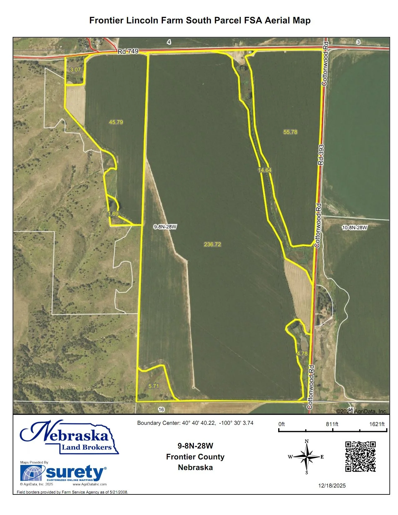 The South Parcel is all that land in Section 9-T8N-R28W of the 6th P.M., Frontier County NE. and includes 379.13 taxed acres. There is County Road access on the east and north.
