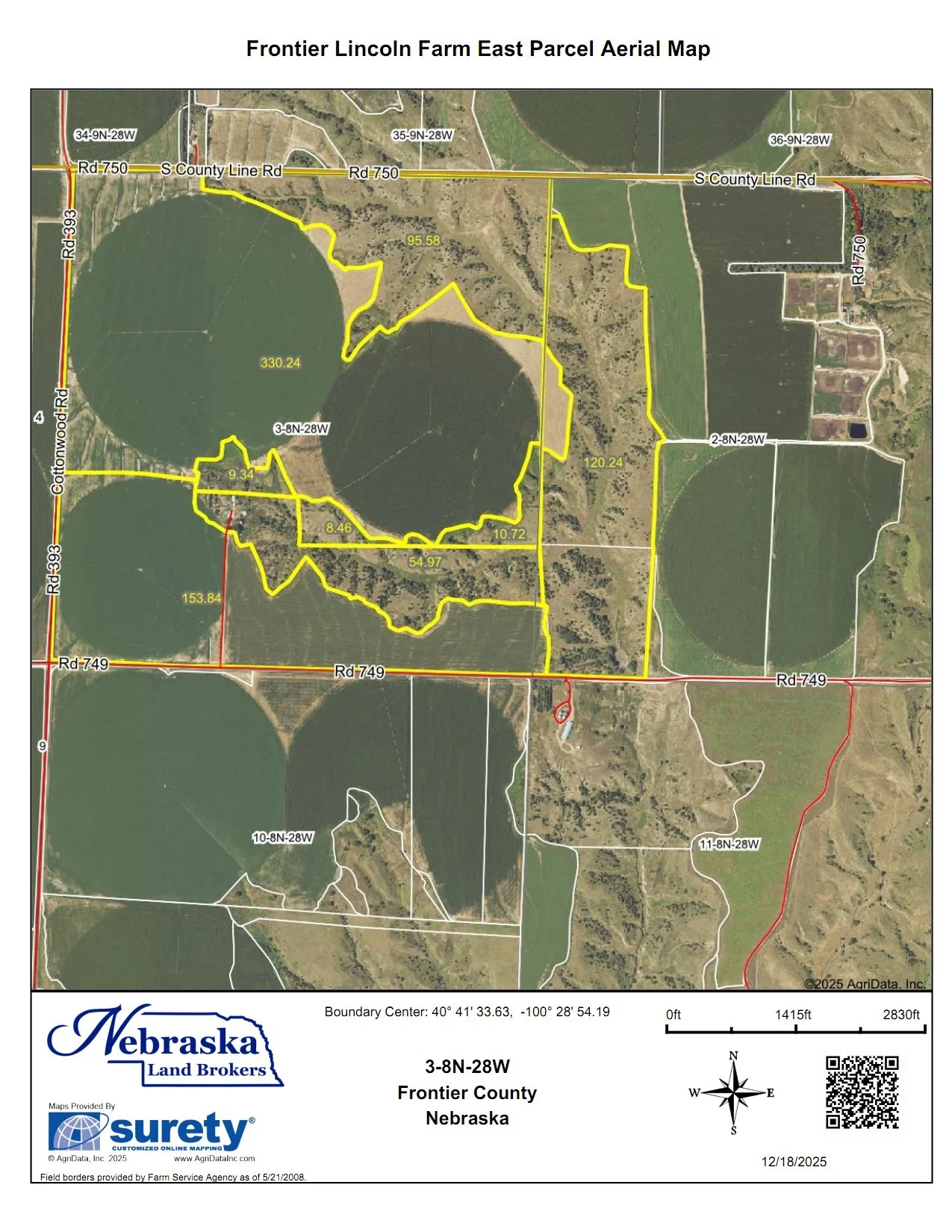 The West Parcel is all that land in Section 4-T8N-R28W of the 6th P.M., Frontier County NE. and Sections 33 & 34-T9N-R28W of the 6th P.M., Lincoln County NE. includes 900.98 taxed acres. There is County Road access on the south and east.